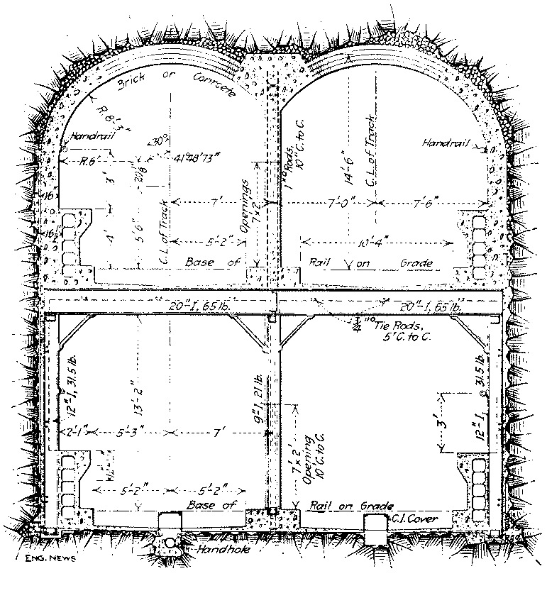 To the right is a turn-of-the-century (not this century, the last century) cross-sectional drawing of two subway lines running along Lexington Avenue on Manhattan’s east side. For some reason, for me it’s easy to visualize a single line — with one uptown and one downtown set of tracks — dug through the earth beneath the asphalt grid above, but it’s much more difficult to picture the subway for the multi-layered maze that it really is, with tracks running under tracks, sometimes in parallel (as shown to the right) and sometimes not. Where two lines pull into a station one above the other or side-by-side, navigating between them is a pretty easy chore — you’ll typically go up or down a set of stairs or an escalator or two, occasionally crossing under or over the trains above or below to get to the proper uptown-downtown, inbound-outbound platform. But the distance you’ll travel is relatively short, and as you’re doing it, the multi-level structure of the station becomes a bit clearer.