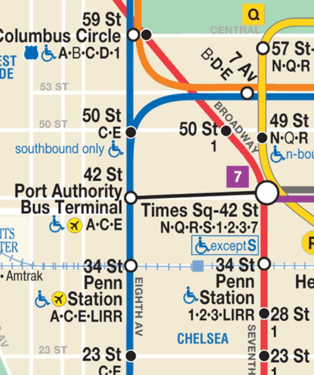 What the map doesn’t make clear is the amount of exercise you’ll get when “hopping” from the N-Q-R or 7 lines to the A-C-E line at 42nd Street. Along with the series of twists, turns and ascents and descents you’ll make during that transfer, you’ll also get a good 10-15 minute walk in, or more if you’re moving at a less-than-decent clip.