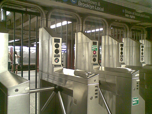 My prior thoughts notwithstanding, getting through the turnstiles just might be the toughest challenge the subway presents. I’ve decide that those “crooks” who hop the stiles don’t do so to save a few bucks; they do it to save themselves the hassle. With few exceptions, every trip on an MTA vehicle (no matter how short or how far you travel) costs two-dollah, fiddy-cent. Access requires a MetroCard, which acts as a debit card to which you apply funds and then deplete as you pass through the stiles.